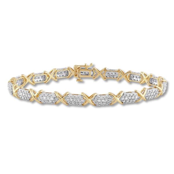 This incredible bracelet for her features brilliant clusters of round diamonds separated by 10K yellow gold “kisses.” The 7.5-inch bracelet has a total diamond weight of 3 carats and fastens with a tongue clasp.
