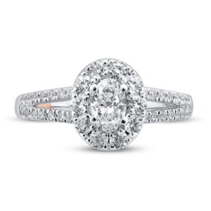 A haloed oval with split shoulders reminds us that it is always time for love in this exquisite women’s engagement ring from world renowned designer. Even more fiery round diamonds adorn the under gallery and envelop the split- shank band to complete the look. Fashioned in 14K two-tone gold, the total diamond weight of the ring is 1-1/8 carats.