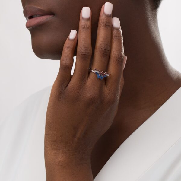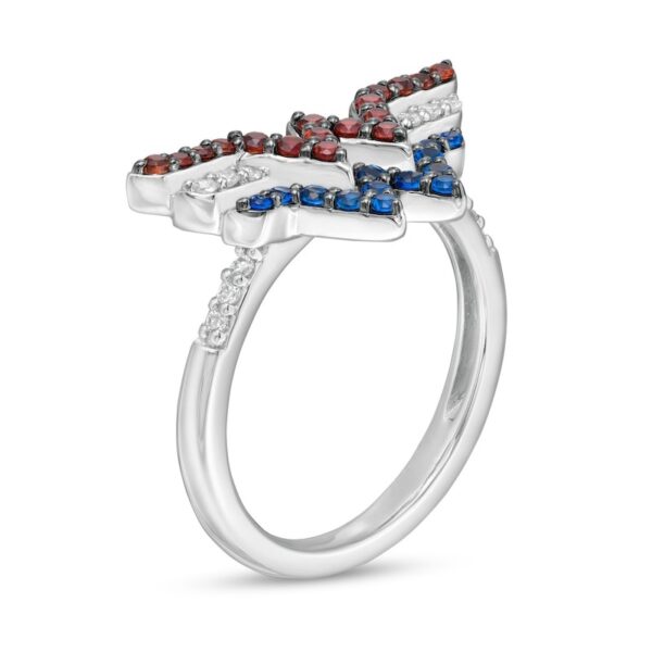 Crafted in sterling silver, this ring features majestic red garnets, brilliant sapphires and sparkling diamonds. Diamonds adorn the setting for an added touch of shimmer. This design captivates with 1/15 carat diamonds and brilliant polished brilliance, making a bold statement. This ring is only available in size 7. Sterling silver rings cannot be resized after purchase.