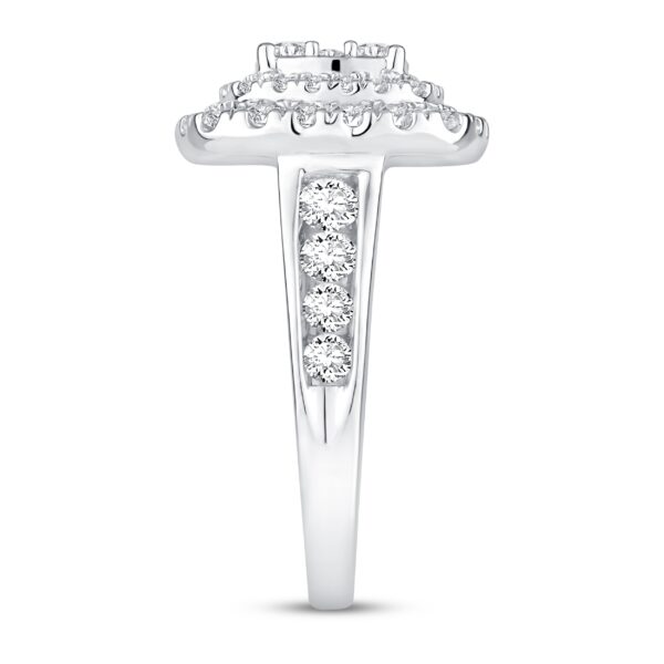 This breathtaking women’s engagement ring features a myriad of brilliant round diamonds stacking atop a 14K white gold band. Sparkling diamonds line halfway down each side of the band to bring the total diamond weight to an impressive 2 carats.